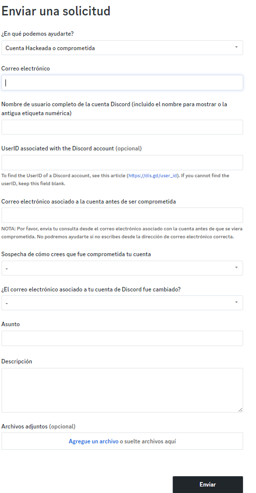 - Haz clic en el enlace para Contactar con Soporte o visita la página de soporte de Discord: https://support.discord.com/hc/en-us/requests/new