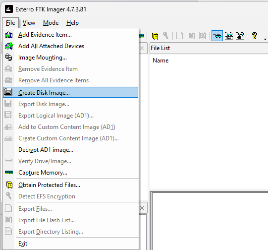 - Elegir la fuente (dispositivo de origen): En la ventana principal de FTK Imager, seleccionar "File" en la barra de menú y luego elegir "Create Disk Image".