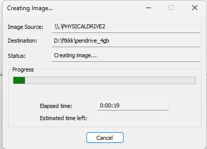 - Monitorizar el proceso: Durante la creación, FTK Imager mostrará el progreso en una barra de estado. Este proceso puede tardar dependiendo del tamaño del dispositivo de origen.