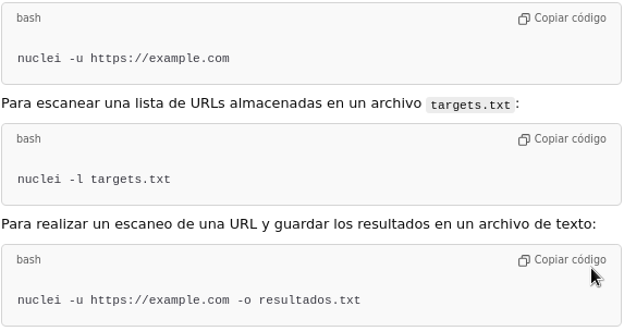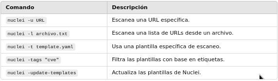 - Ejecución: Cuando ejecutas Nuclei, la herramienta lee las plantillas e intenta identificar si los objetivos (por ejemplo, un sitio web) son vulnerables a las pruebas definidas.