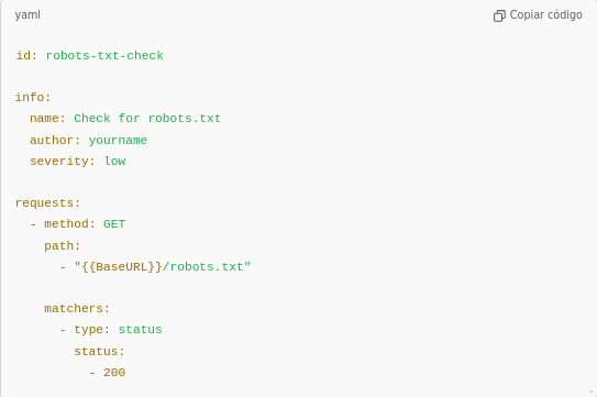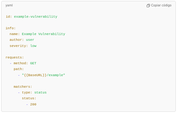 En este ejemplo, Nuclei envía una solicitud GET a {{BaseURL}}/example y verifica si la respuesta tiene un código de estado 200. Si coincide, se considera que la vulnerabilidad está presente.